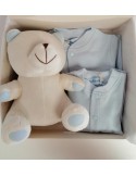 Ce coffret cadeau contient une paire de chaussons très doux, un doudou ours à pois, un cœur et une étoile décorative à pois, assortis.